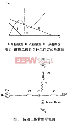 隧道二极管是个电压多值元件,它可以工作在单稳触发、双稳触发和自由多谐振荡3种方式下,3种工作方式的负载线。在本方案中,通过偏置电路将隧道二极管的工作状态设为单稳触发模式,在保证脉宽不改变的前提下,对脉冲的上升、下降沿进行整形。图3即为单稳触发状态下的隧道二极管整形电路原理图。