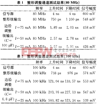 从测试数据来看,实验结果与理论计算结果非常相似,但还是存在一些差异,这主要是由于在分析过程中对电路进行了适当的近似和简化,以及在电路制作中引入的寄生电容等不确定因素造成的。可以看出,该方案对80MHz以内的脉冲信号能起到较好的边沿整形和调整的效果。