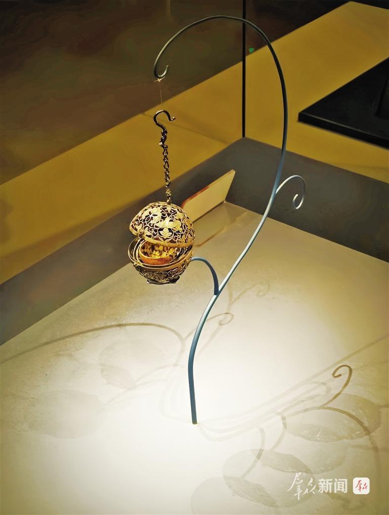 “香囊外壳、机环、焚香盂之间,以银质铆钉铆接,可自由转动。神奇的是,由于机环和焚香盂自身重力的作用,无论香囊怎样转动、晃动,焚香盂始终都能保持重心向下、纹丝不动,确保里面的香料保持稳定。”5月25日,讲解员徐大卫说,这是因为香囊内部的持平装置类似于陀螺仪。